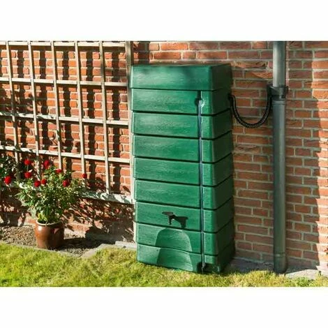 Le récupérateur d’eau tonneau forme murale est en polyéthylène haute densité, traité anti-UV, coloris vert, équipé de deux robinets, une jauge extérieure pour visualiser le volume d’eau stocké.