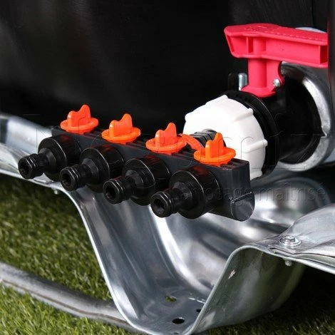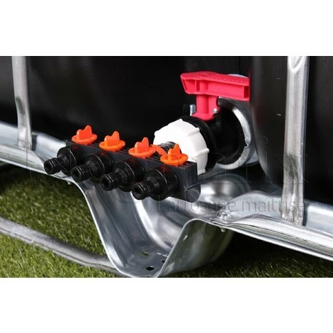 Cet ensemble est composé du bouchon adaptateur, d’une quadruple sortie arrosage mâle avec vanette 1/4 tour séparée pour connecter directement vos tuyaux d’arrosage à votre cuve de récupération d’eau.