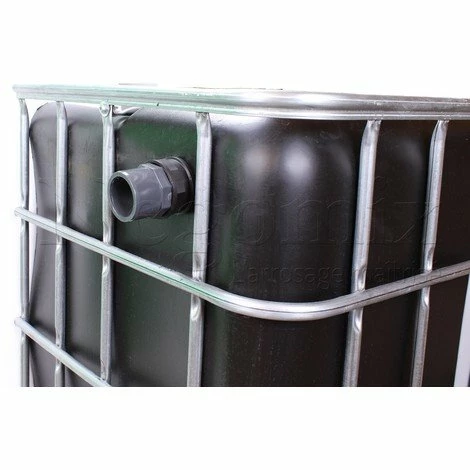 Raccord passe paroi installé en partie haute d’une cuve de récupération d’eau avec branchement sur tuyau PVC à coller de :